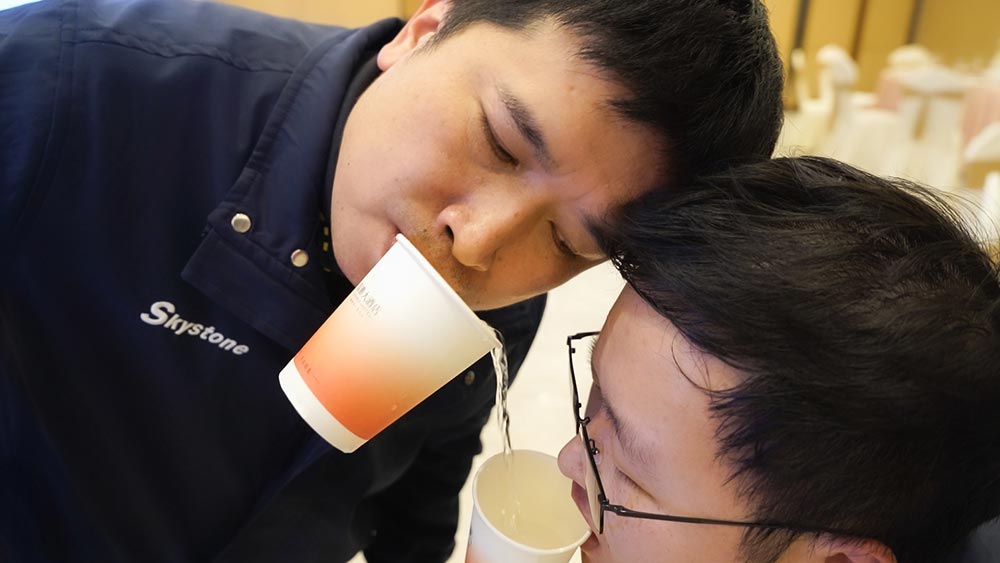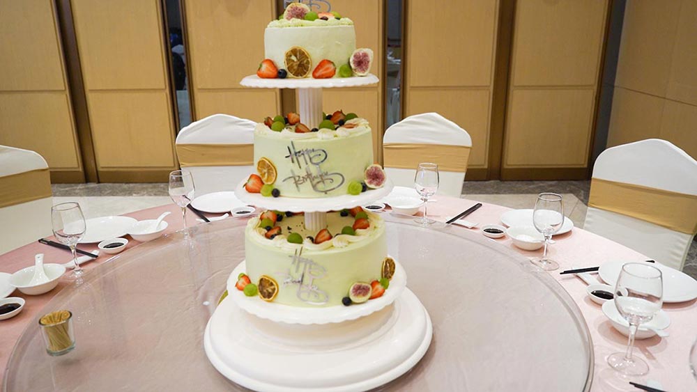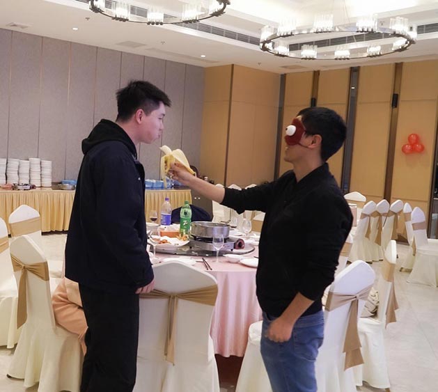 生日会现场,寿星们不仅享有菜色精美、菜品丰盛的生日宴,更有多个轻松愉快、乐趣无穷的精彩游戏供寿星们休闲娱乐。需要多人协助配合,考验团队协作能力的《纸杯传水》游戏,考验两人默契配合的《蒙眼喂香蕉》、《你画我猜》游戏,考验反应灵敏度的《桃花朵朵开》游戏,每个游戏都十分精彩与欢乐,让寿星们在繁忙的工作之余感受到来自天石源大家庭的关怀与温暖。