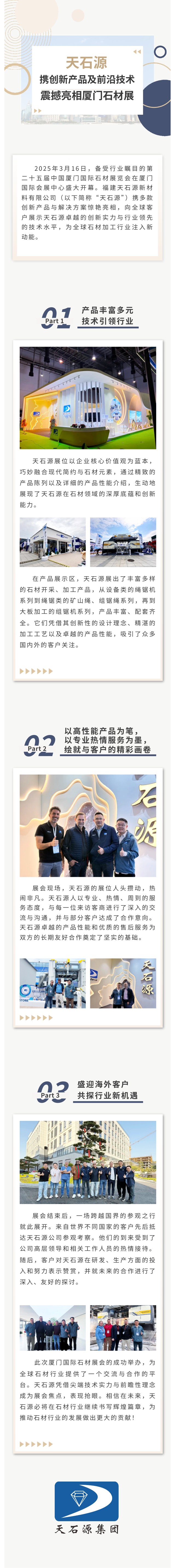 【概要描述】2025年3月16日,备受行业瞩目的第二十五届中国厦门国际石材展览会在厦门国际会展中心盛大开幕。天石源携多款创新产品与解决方案惊艳亮相,向全球客户展示天石源卓越的创新实力与行业领先的技术水平,为全球石材加工行业注入新动能。